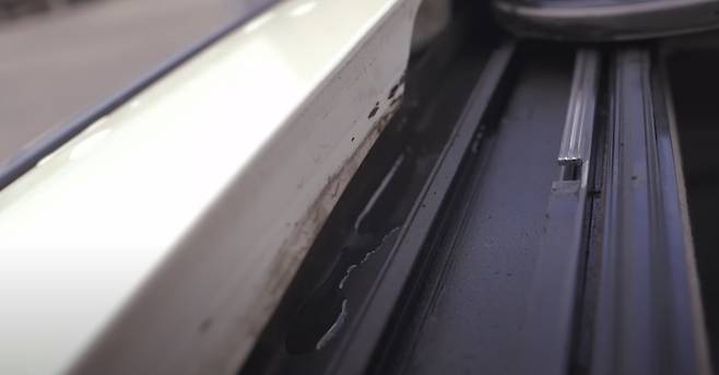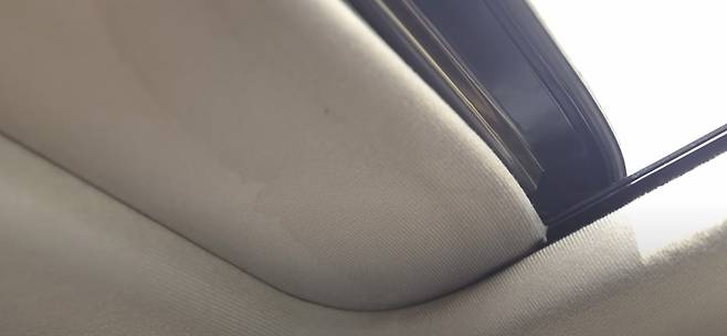 선루프를 열어보았을 때 많지는 않지만 물이 선루프 고무패킹을 넘어 어느정도는 유입된걸 확인할 수 있었으며, 이렇게 유입된 물의 양이 많아져서 물이 차게되면 아까 확인해본 배수구멍을 통해 외부로 빠져나가는 것을 알 수 있었습니다.