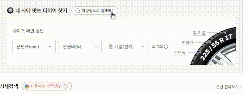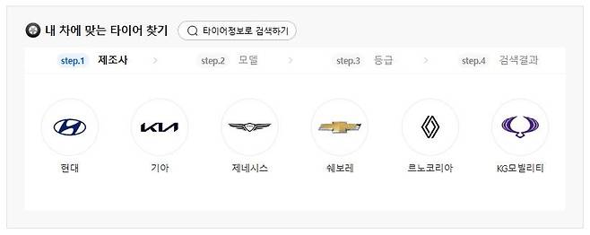 이마저도 피곤하다면, 내 차량 정보를 입력하여 찾는 방법도 있다. 방금 살펴본 서비스에 차종을 입력하면 내 차에 딱 맞는 타이어를 알려준다. 제조사 고르고, 모델 선택하고, 상세 스펙까지 누르면 끝이다. 그럼 또 맞는 타이어가 나올 것이다. 이후에는? 그중에서 마음에 드는 걸로 고르면 미션 컴플리트.