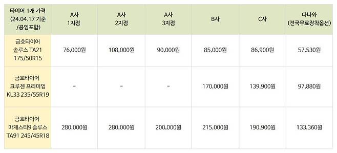 알다시피 타이어는 안전에 직결되는 용품이다. 하지만 교체 비용이 비싸도 너무 비싸다. 찾아보니 뭐...타이어 뱅크 같은 전문점, 블루멤버스, 코스트코 타이어 교체 등... 방법은 많은데, 실제 오프라인 가격은 어떨까? 각각의 판매점에 임의로 전화를 걸어 물어봤다.