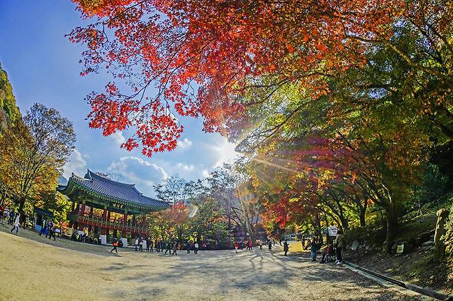 백양사 입구부터 쌍계루까지 이어지는 단풍길은 가을 하늘 아래 고운 색감을 자랑하며 걷는 내내 마치 단풍의 터널을 지나가는 듯한 느낌을 줍니다.