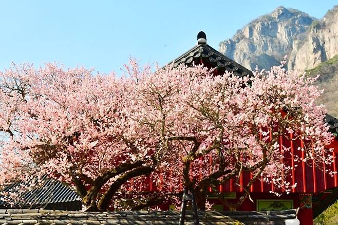 사찰 입구에서부터 길게 늘어선 벚나무들이 분홍빛 터널을 이루며, 따뜻한 봄 햇살 아래 걷기 좋은 산책길이 펼쳐져요.