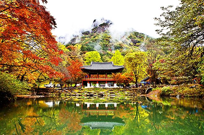 사찰 안쪽으로 들어가면 연못 위에 세워진 전통 건축물 ‘쌍계루’가 보이는데, 연못에 비친 벚꽃과 푸른 하늘이 어우러진 모습이 한 폭의 그림처럼 펼쳐집니다.