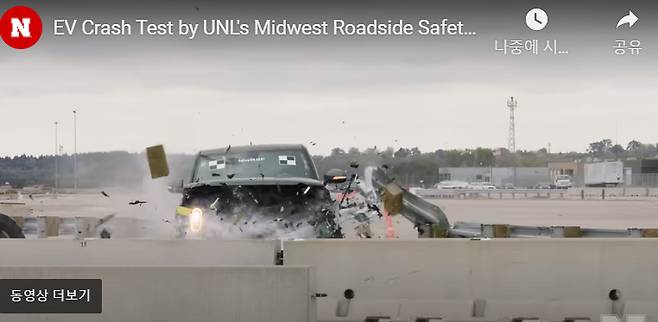 미국의 네브라스카 대학에서 최근 가드레일 테스트를 실시한 결과 전기차는 무거운 배터리 때문에 가솔린차보다 가드레일을 쉽게 찢어 버렸다.