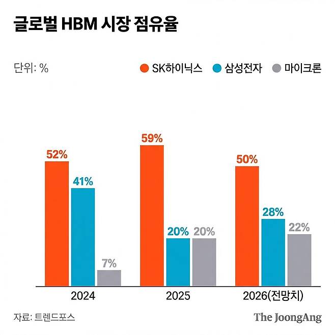 마이크론의 HBM4 양산 합류로 AI 메모리 시장 경쟁은 한층 치열해질 전망이다. 시장조사업체 트렌드포스는 2026년 HBM 점유율이 SK하이닉스 50%, 삼성전자 28%, 마이크론 22%로 재편되며 ‘3강 구도’가 굳어질 것으로 내다봤다. 삼성전자는 전년대비 8%포인트, 마이크론은 2%포인트 점유율이 확대될 것으로 예상된다.
