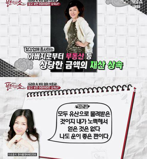 박준금은 압구정 아파트, 춘천의 건물, 대부도의 땅을 물려받았다고 밝혔다.