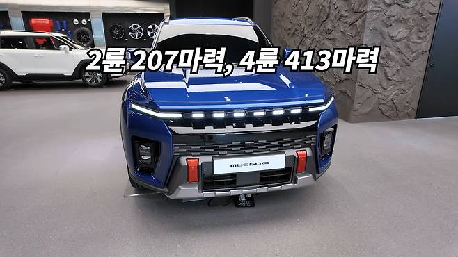 무쏘 EV의 4륜 구동 버전은 기존 KGM 모델 중 가장 강력한 413마력의 출력을 자랑한다. 이는 제어 난이도가 높은 수준의 힘으로, 토레스 EVX 모델이 이 기록을 세운 것으로 알려졌다.