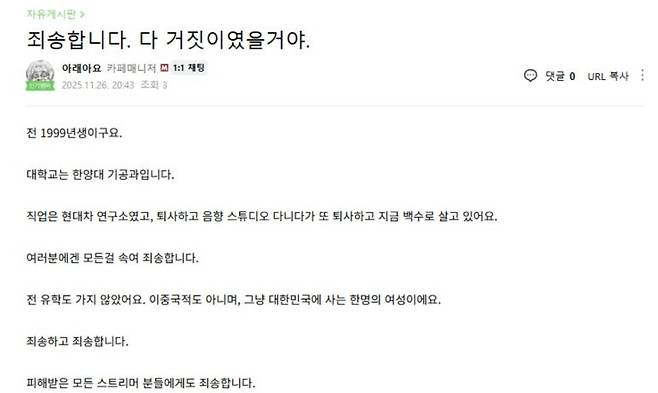 아래아요 학력, 나이 등 빨간약 거짓말 인정하며 사과..방송 은퇴 선언 후 채널 삭제