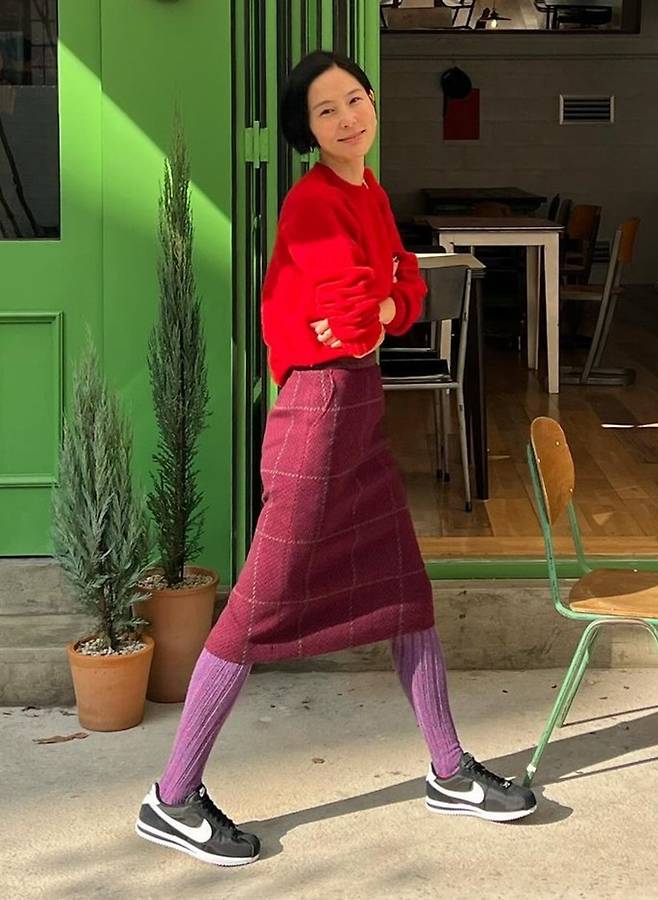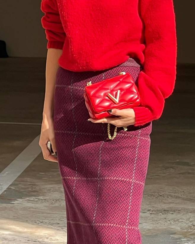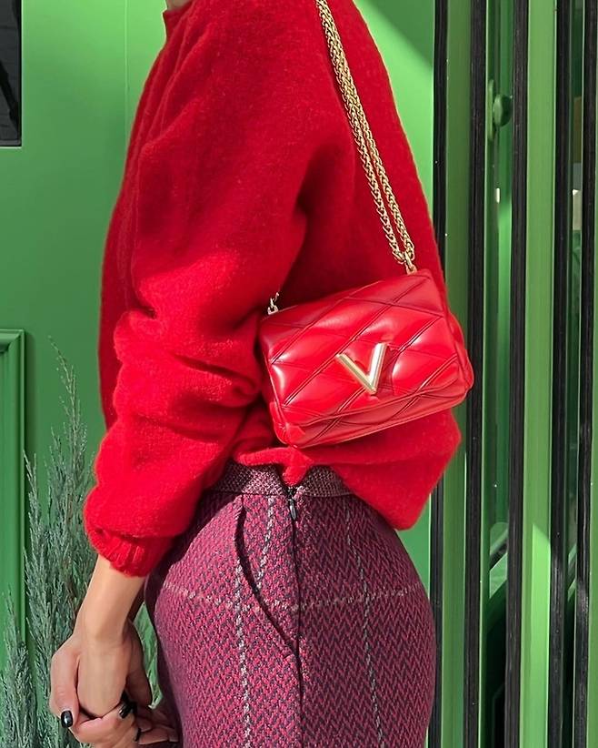 공개된 사진 속 김나영은 레드 니트 스웨터와 깔맞춤한 미니 레드백으로 센스 있는 가을룩을 연출했다.