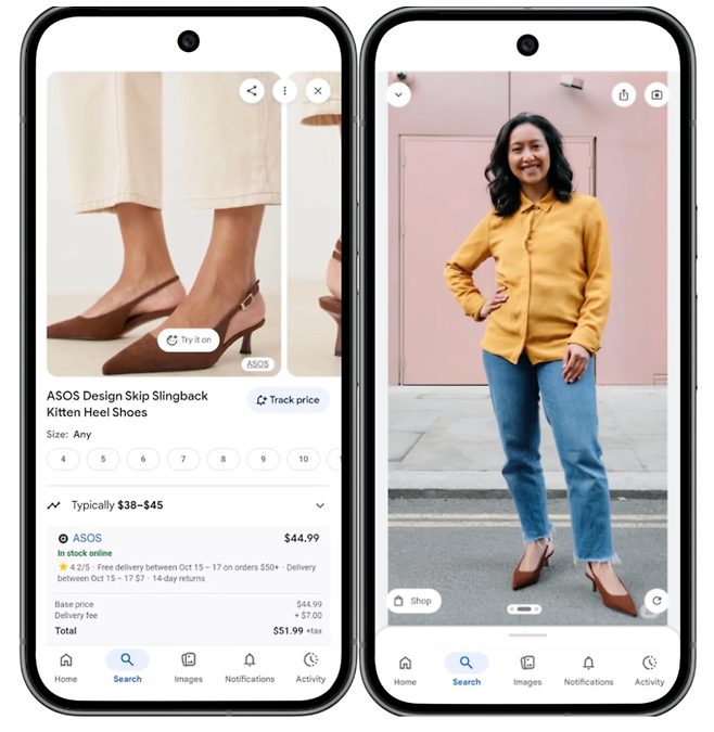 이번 업데이트로 이용자는 구글 쇼핑에서 원하는 상품을 선택한 뒤 ‘착용해보기(try it on)’ 버튼을 누르고 전신 사진을 업로드하면 된다. 몇 초 안에 해당 신발이나 의류를 착용한 자신의 모습을 확인할 수 있다.