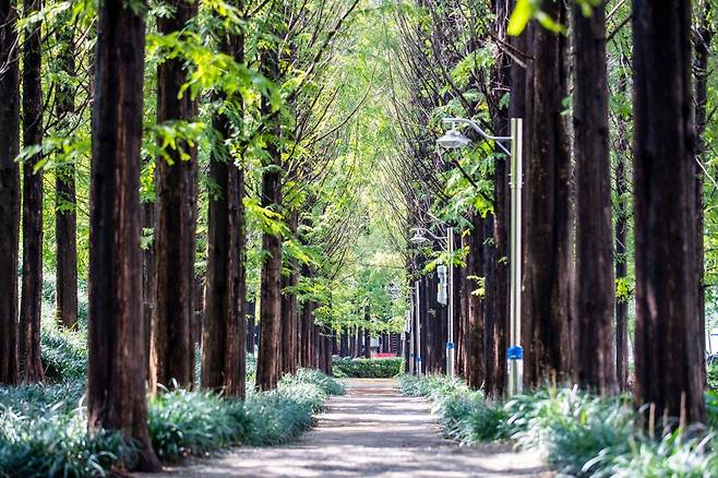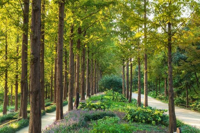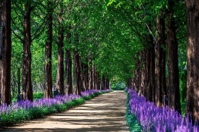 고속도로 방음벽 사이 버려진 부지를 활용해 조성된 광주 맥문동 숲길은, 7~8월 메타세쿼이아 나무와 어우러진 신비로운 보랏빛 맥문동 꽃길로 유명한데요.