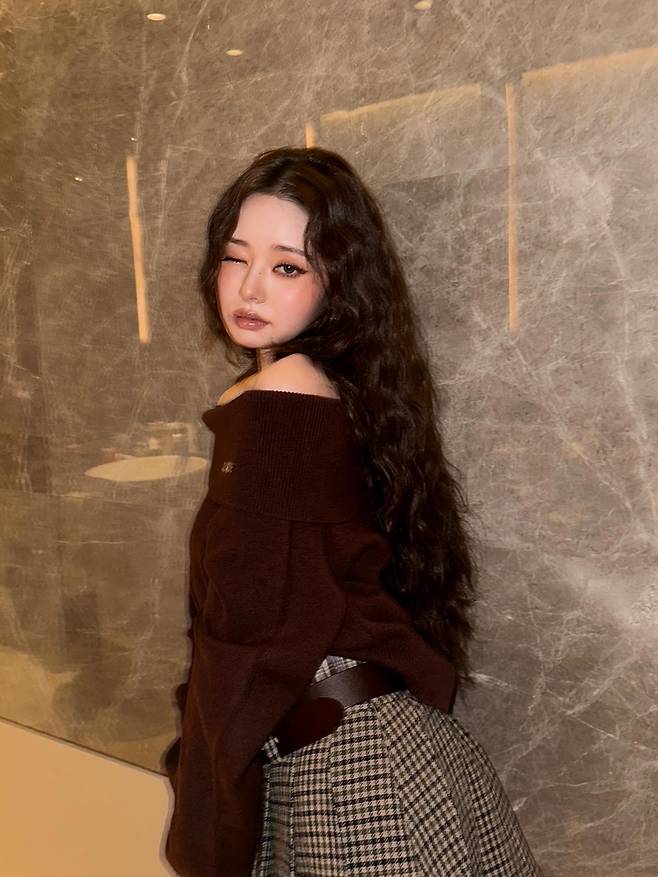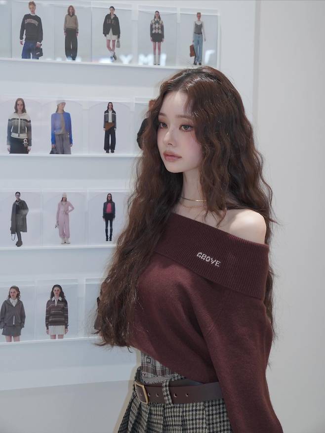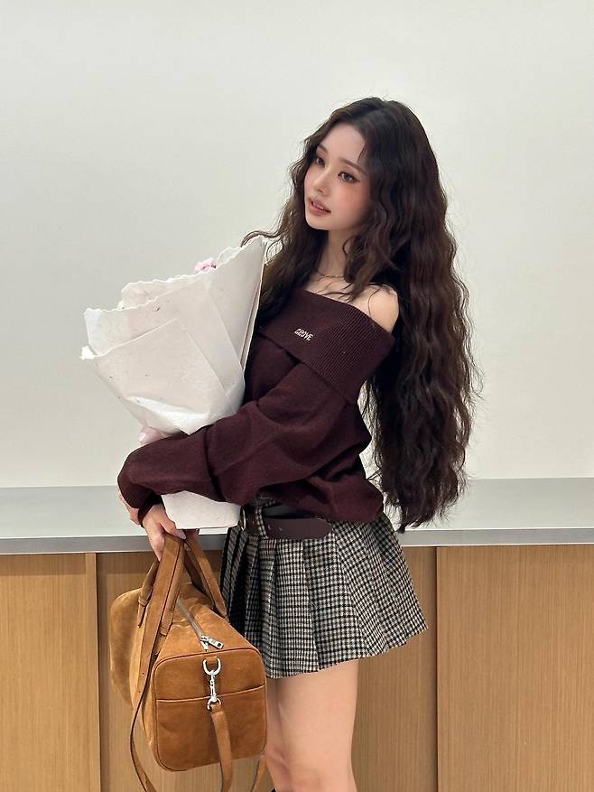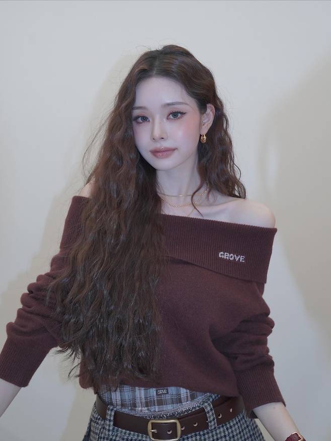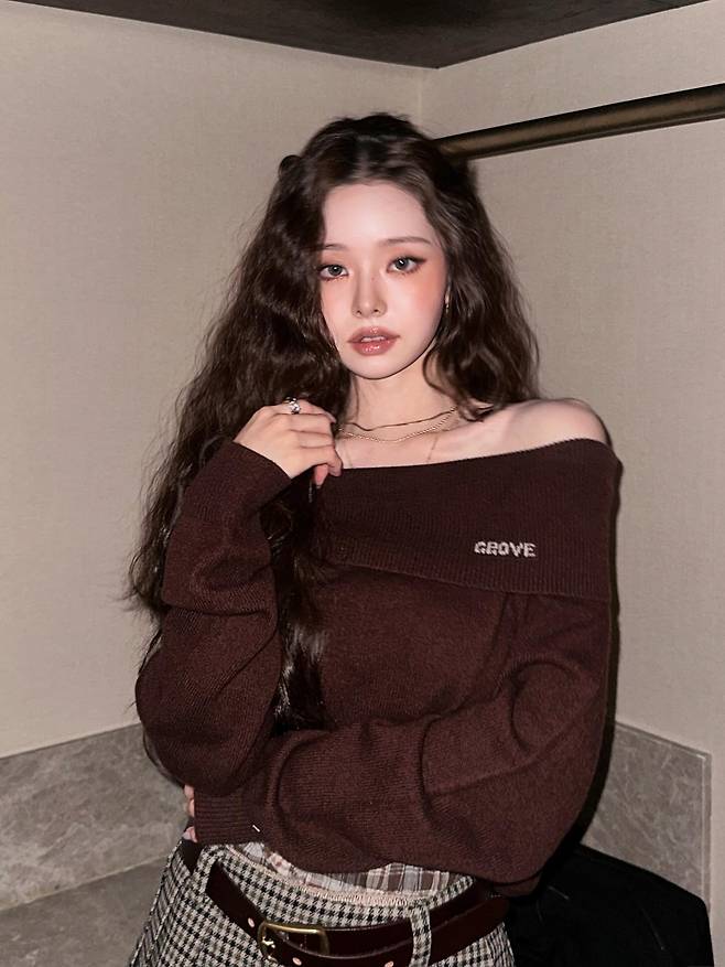 오프숄더로 살짝 내려간 브라운 니트는 부드러운 실루엣을 강조하면서도 어깨라인을 자연스럽게 드러내, 우아한 여리미를 완성했어요.
