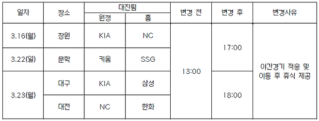 한국야구위원회(KBO)가 야간경기 적응 및 이동 후 휴식 제공을 위해서 2026년 KBO 시범경기 중 4경기의 시작 시간을 저녁 시간대로 변경한다고 27일 밝혔다.