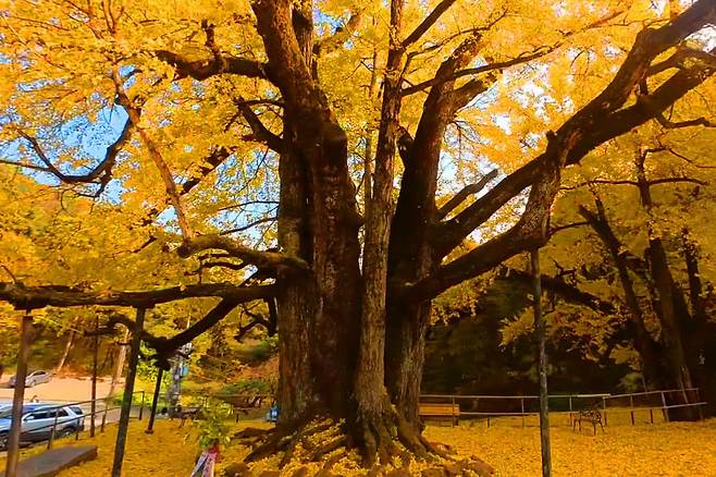 걷다 보면 수령 800~1000년으로 추정되는 황금빛 거대한 은행나무를 볼 수 있는데요. 우리나라에서 보기 힘든 신령한 고목입니다.