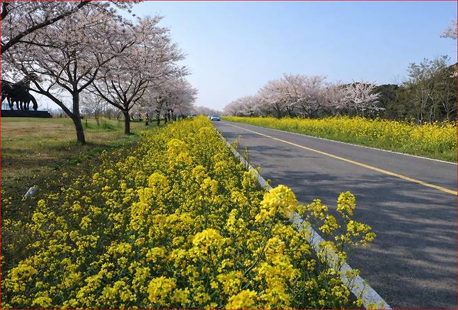 2006년 당시 건설교통부가 ‘한국의 아름다운 길 100선’으로 선정한 이 길은, 약 10km 구간에 걸쳐 땅에는 노란 유채꽃이, 하늘에는 하얀 왕벚꽃이 터널을 이루는 경이로운 풍경을 선사합니다. 과거 왕실의 최상급 말들을 사육하던 ‘갑마장’의 광활한 기운 위에 이제는 꽃잎이 흩날리며 여행자를 유혹합니다.