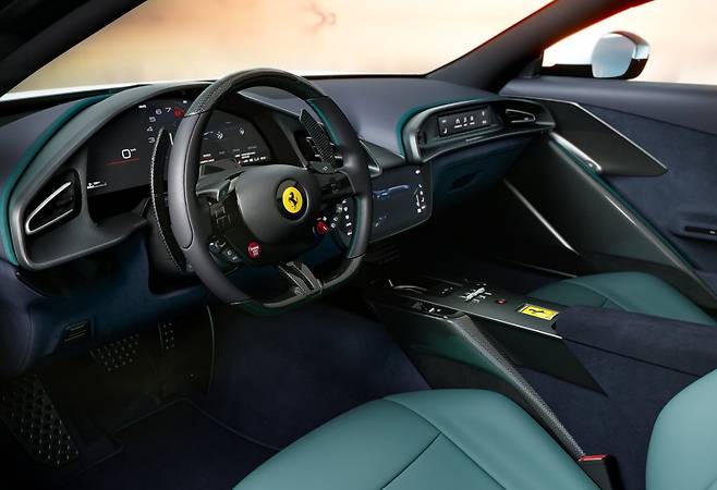 그 다음은 실내공간. 듀얼 콕핏(운전자와 동승자 각각을 감싸는 듯한 독립적인 공간 구성) 레이아웃이 적용되었고, 신형 스티어링 휠에는 물리 버튼과 함께 페라리의 상징적인 시동 버튼이 다시 도입됐다.