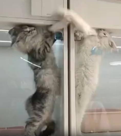 바로 그 틈—유리문과 천장 사이 아주 좁은 틈새로, 앞발이 스르르 올라옵니다. 그리고 그 반대편 칸에서도 또 하나의 앞발이 쓱 모습을 드러내죠. 이어지는 건, 다정한 인사도, 조용한 터치도 아닌… 치열한 ‘앞발 배틀’입니다. 두 고양이는 마치 펜싱을 하듯 팔을 뻗고, 서로의 발을 툭툭 건드립니다. 조용한 싸움, 그러나 눈빛만큼은 날카롭습니다.
