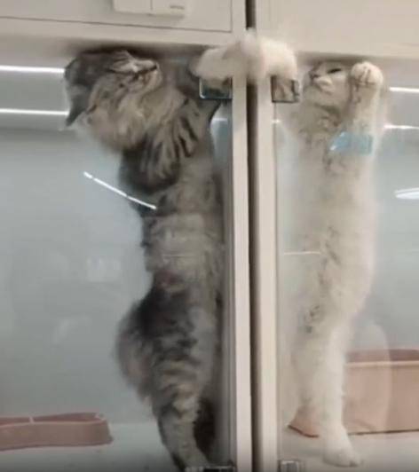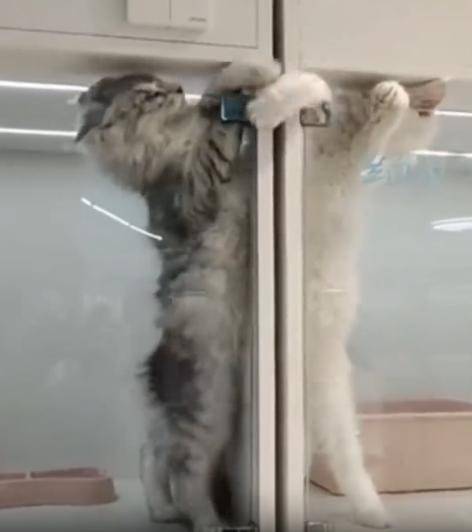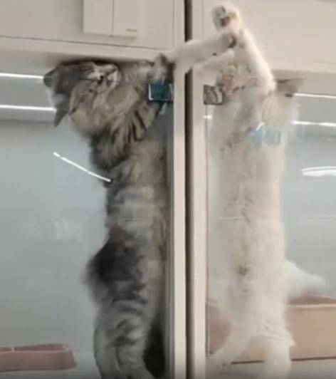 투명한 벽 너머, 손만 닿는 거리의 고양이 라이벌전