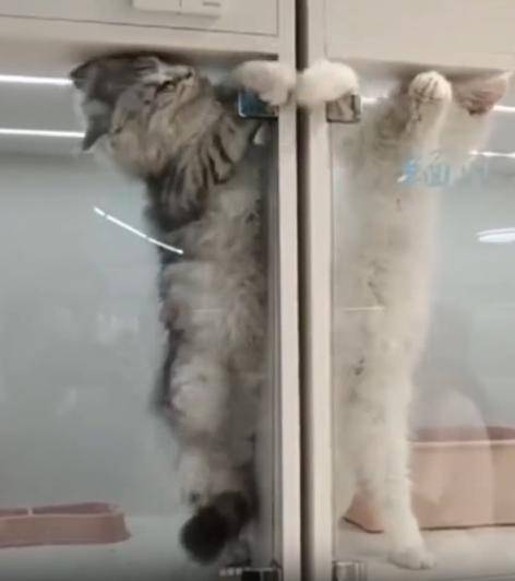 투명한 유리문으로 닫힌 작은 칸들. 마치 고양이 전용 아파트처럼 정갈하게 나뉜 공간 속, 각각의 칸에 고양이 한 마리씩 자리를 잡고 있습니다. 고요할 것만 같은 이 정돈된 풍경에 뜻밖의 긴장감이 감돕니다.
