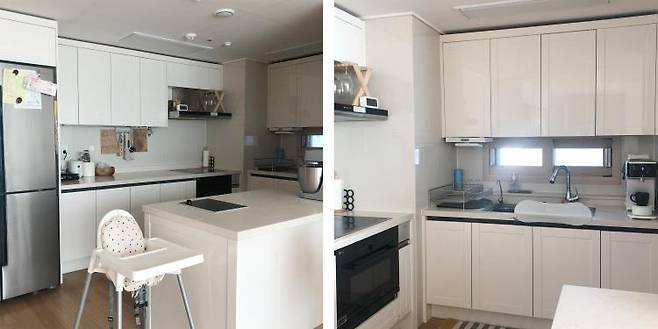 원래 화이트톤의 아파트라 크게 손볼 곳이 없어 싱크대와 붙박이 시트지 시공과 싱크대 타일 셀프 페인팅만 하고 가구와 소품 스타일링만으로 집을 꾸미게 되었어요.