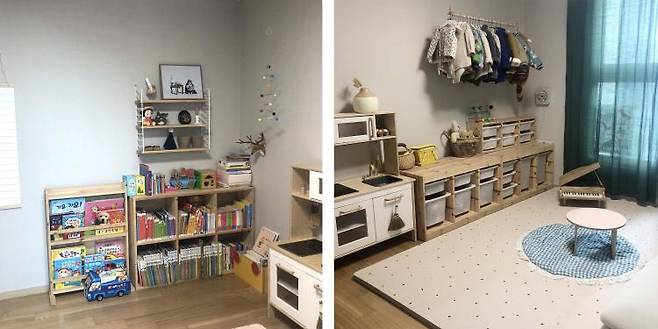 저희 집에서 가장 복잡하고 알록달록한 것들이 많은 곳이에요. 정말 최대한 미니멀하게 지내자고 하는데, 사고 사고 또 사는 게 아기용품이네요.