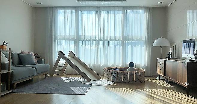 지은 지 4년 정도 된 비교적 신축 아파트예요. 원래도 같은 브랜드의 24평 아파트에 살았었는데 아기가 태어나고 절대적으로 부족한 수납공간 때문에 점점 어지럽혀지는 거실을 보며 고민을 하던 중 넓은 거실과 구석구석 수납공간, 세대별 지하창고까지 갖춘 33평형으로 이사를 오게 되었어요.