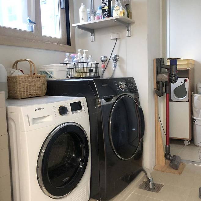 보기 싫은 소형가전은 안쪽 베란다 선반에 모두 두고, 앞쪽 베란다엔 세탁기와 건조기 등 자주 사용하는 가전을 두었어요. 넓지 않은 공간이다 보니 최대한 정리 정돈을 열심히 하는 편입니다.