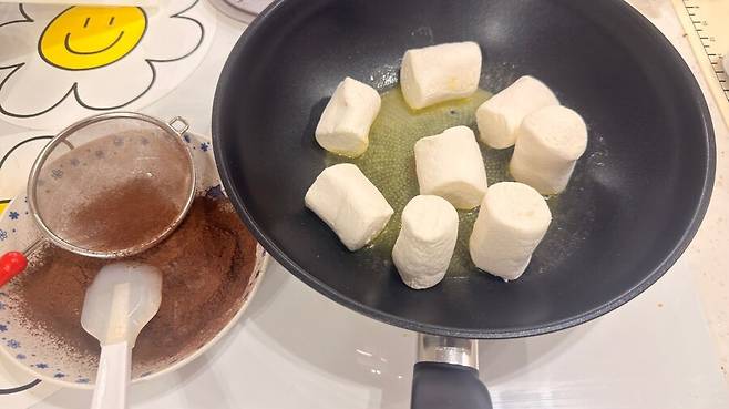 코팅이 잘 된 팬에 버터를 두르고, 마시멜로우를 녹일 거에요.