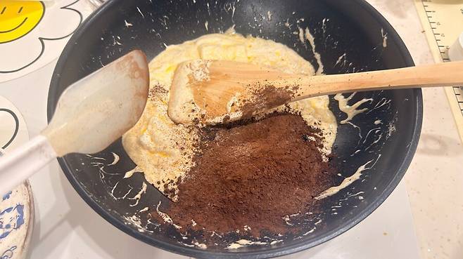 흐물텅하게 녹으면, 불 끄고, 체 쳐서 내린 코코아 파우더와 탈지분유를 마구닥 섞어 줍니다.