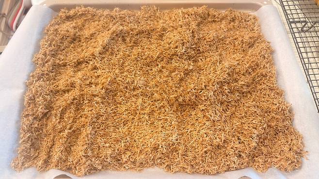 구운 카다이프면을 사긴 했지만, 버터를 녹여서 잘 섞어준 다음 오븐으로 몇 번 더 구워 줄 겁니다.