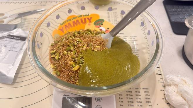피스타치오 페이스트와 피스타치오 분태 (어우 길어..), 카다이프면과 녹인 화이트 커버춰를 섞어 줍니다.