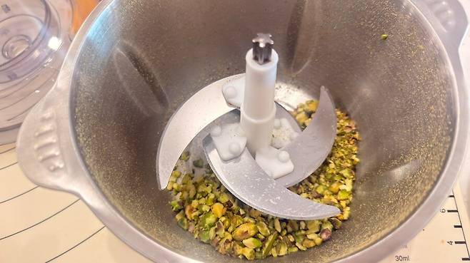 그리고 토핑용, 필링용으로 쓸 피스타치오를 팬으로 볶은 뒤 분태 만들기 (갈갈~)