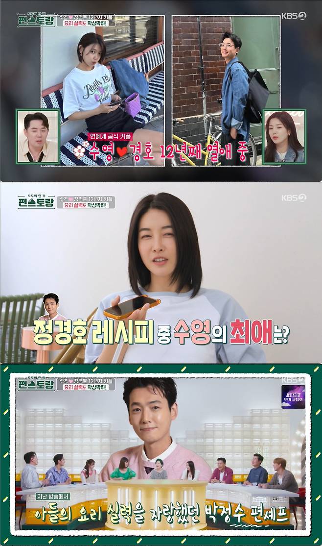 진서연은 "경호가 요리 잘하지 않냐"라 했고 수영은 "오빠 요리 잘한다"며 곧장 대답했다. 12년째 공개 열애 중인 수영과 정경호. 진서연은 "경호는 섬세하고 다정하고 계속 챙겨준다"라 칭찬했다.