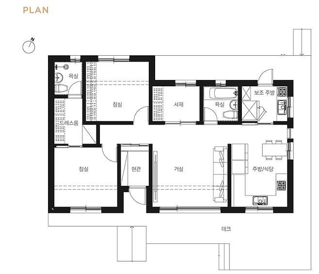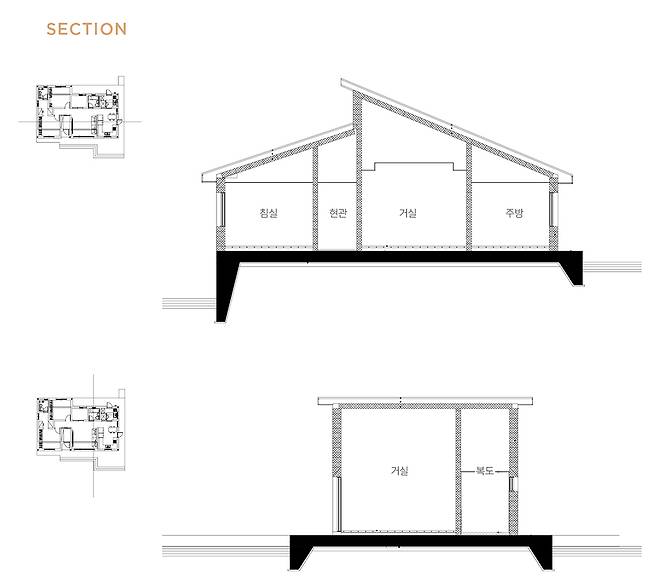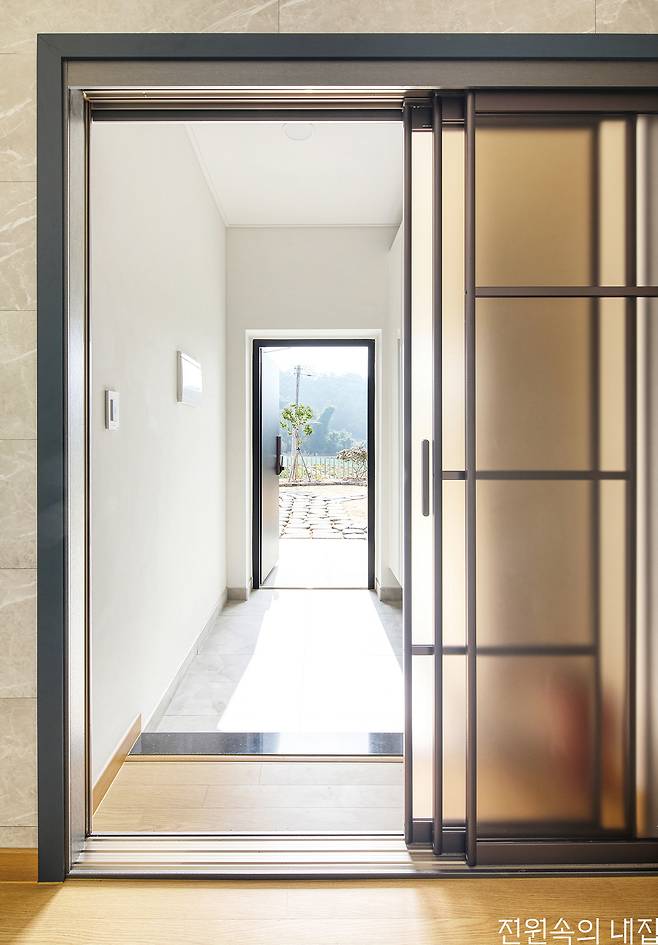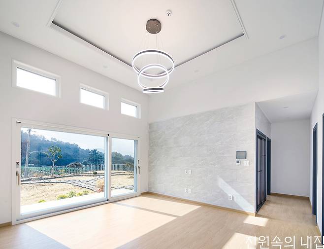 간결하지만 매력적인 외부는 건축주의 취향과 새롭게 찾아낼 취미가 담길 마당으로 완성된다. 작게 구성된 텃밭은 물론 추후 조경을 위한 디딤석 구획, 넉넉한 규모의 석재 데크는 풍경이 함께하는 전원생활을 즐기기에 안성맞춤이다. 디딤석을 따라 집으로 들어서면 널찍한 현관이 만드는 편안한 분위기를 먼저 만난다. 생활의 편안함을 갖춘 실내에서도 가장 눈에 띄는 것은 높은 천장고의 거실과 이어지는 서재 공간이다. 앞으로는 자연을, 뒤로는 마을의 풍경을 즐기며 사색할 수 있는 공간으로 꾸밀 예정이다.