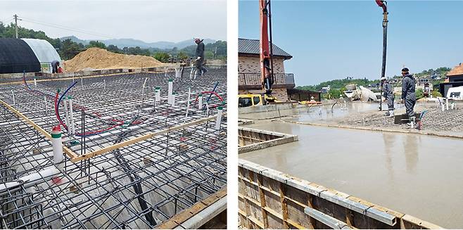 28평이라는 소규모 건축 구조기준에 맞게 철근의 배근 및 시공이 가장 먼저 진행된다. 하부 철근의 피복두께는 80mm 이상, 상부는 40mm 이상으로 이어야 하며 정밀한 측량 후 기초의 바닥면이 동결심도 이하에 위치하게 두며 450mm 두께로 설정해준다.