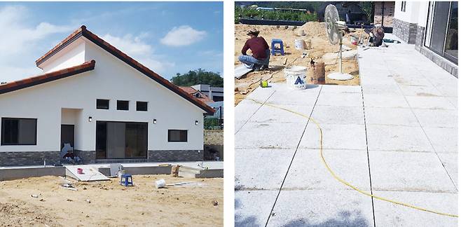 내부 천장틀까지 설치함과 동시에 외장재의 마무리가 진행된다. 청주 주택 현장은 건축주의 취향에 따라 황토색 스페니쉬 기와를 더하고, 외벽 하부에 그레이 컬러 석재타일을 사용해 외장을 마무리한다. 여기에 판석으로 데크를 넓게 시공해 활용도 높은 외부 공간을 완성했다.