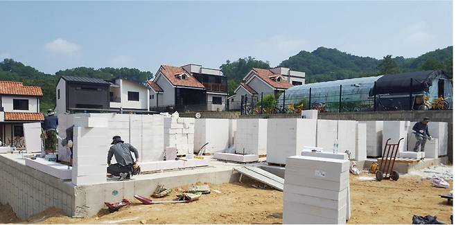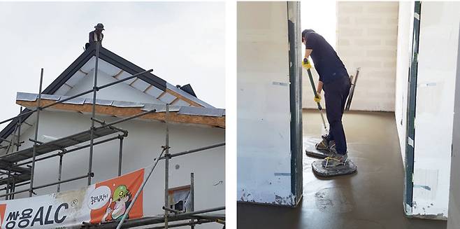 청주는 ‘중부 2지역 단열기준’에 맞춰 시공해야 하므로 외벽은 ALC-i 350mm, 내벽은 100, 200mm를 기준으로 시공한다. ALC-i는 다른 제품보다 단열 성능을 향상시킨 제품이다. ALC 블록은 무게가 가벼운 친환경 자재이기에 3~4일 정도면 벽체 시공을 완료할 수 있다.