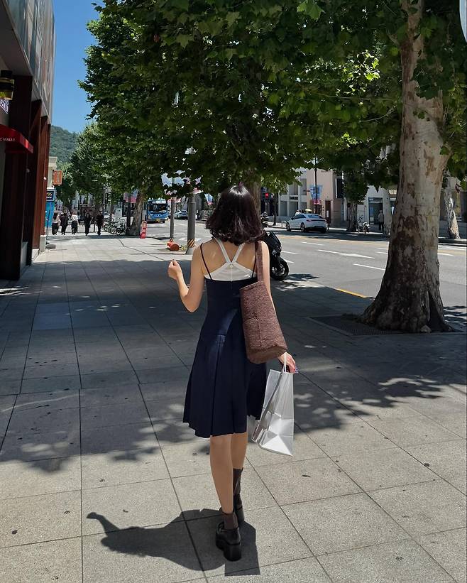 뒷모습이 드러난 컷에서는 원피스의 X자 스트랩 디테일이 강조되며, 전체적으로 군더더기 없이 깔끔한 실루엣이 돋보였어요.