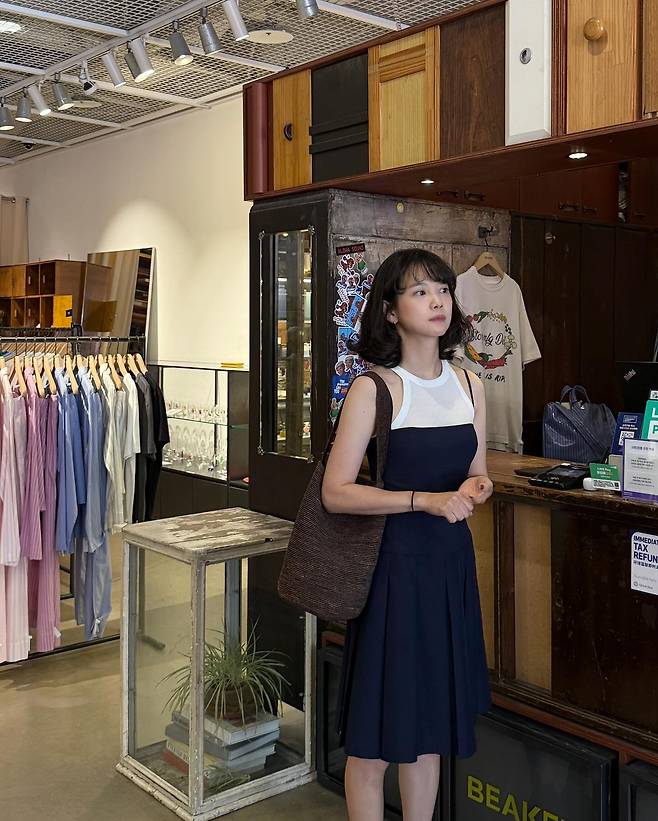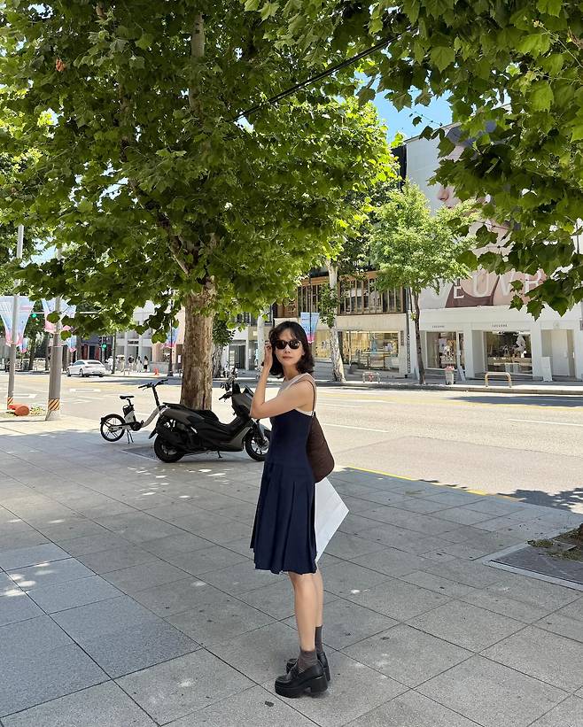 윤승아는 네이비 컬러의 슬리브리스 원피스에 화이트 톱을 레이어드해 단정하면서도 시원한 여름 스타일을 선보였어요.