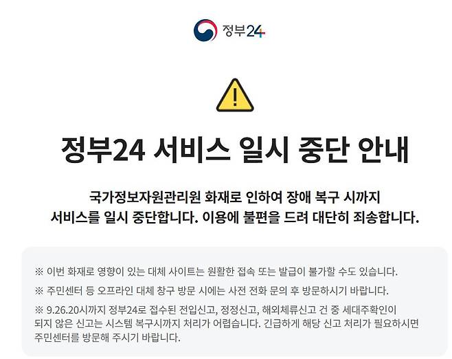 2025년 9월 26일 금요일 오후 8시 15분경, 대전광역시에 위치한 국가정보자원관리원에서 화재가 발생하여 다수의 주요 정부 시스템에 장애가 초래되었습니다 . 이로 인해 현재 647개의 정부 업무 시스템이 가동 중단되는 등 여러 행정 서비스 이용에 불편이 발생하고 있습니다 .