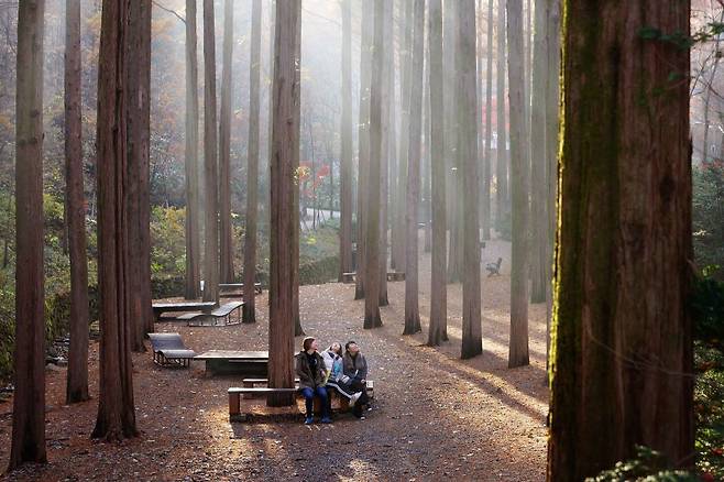 입구를 지나면 울창한 메타세쿼이아 숲이 펼쳐지고, 그 사이로 조용한 산림욕장이 자리한다. 이곳은 나무들이 뿜어내는 피톤치드와 함께 바스락거리는 낙엽 소리, 부드러운 숲의 향까지 온몸으로 느낄 수 있는 공간이다.