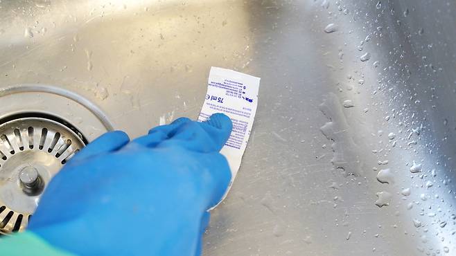 다음은 바로 주방 싱크대를 청소할 차례에요. 싱크대는 음식물 쓰레기, 찌거기가 닿는 곳이기 때문에 기름지고 더러울 수 밖에 없는데요. 이때 잘라 놓은 치약 튜브를 이용해 문질러 주세요.