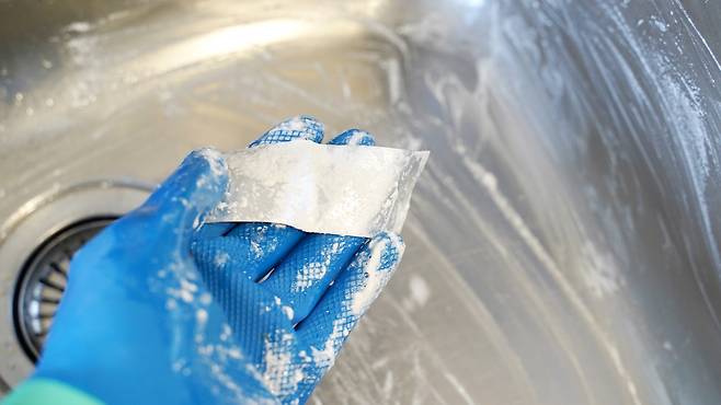 다음은 바로 주방 싱크대를 청소할 차례에요. 싱크대는 음식물 쓰레기, 찌거기가 닿는 곳이기 때문에 기름지고 더러울 수 밖에 없는데요. 이때 잘라 놓은 치약 튜브를 이용해 문질러 주세요.