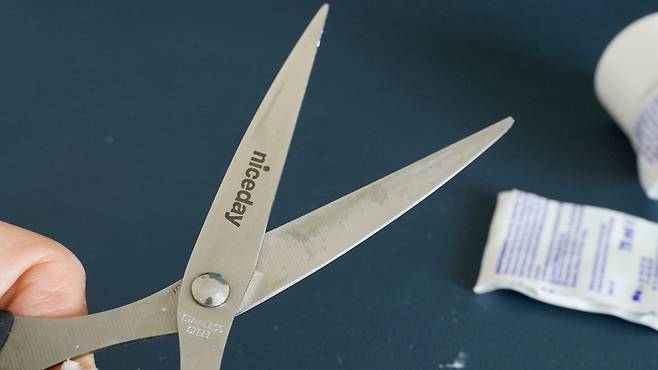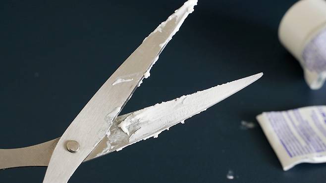 이렇게 남은 치약을 먼저 사용해 볼 곳은 바로 가위에요. 가위를 사용하면 끈끈이나 이물질, 녹 등이 생겨 가위질이 잘 안될 떄가 있는데요. 사진과 같이 충분히 뭍혀 놓으세요.