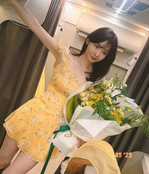 6월의 동해. 강민경은 해변에서 노란색 플로럴 미니 원피스를 입고 낚싯대를 들었습니다.