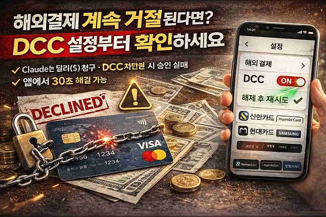 이 경우 이용 중인 카드사 앱(신한, 현대, 삼성 등)에 접속하여 해외 결제 설정 메뉴에서 DCC 차단 설정을 잠시 '해제'한 후 재시도해 보시기 바랍니다. 결제가 성공적으로 완료된 이후에 다시 차단 설정을 켜도 무방합니다.
