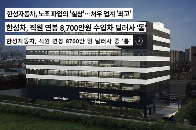 메르세데스-벤츠코리아 최대 딜러사인 한성자동차의 노ㆍ사 갈등이 계속되는 가운데, 임직원 평균 연봉이 8719만원이라는 주장이 나왔다. 근로자들의 처우가 업계 최고 수준이라며 노조를 비판하는 보도도 이어지고 있다. 과연 사실일까?