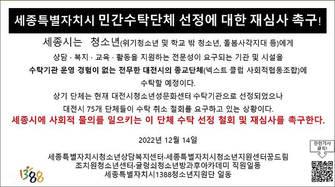 세종특별자치시1388청소년지원단을 비롯한 세종지역 청소년·시민단체들은 타 지역에서 청소년관련 기관 수탁으로 논란이 되고 있는 단체에게 세종지역 청소년 사업을 맡겨서는 안 된다며 심사결과 철회와 재심사를 촉구하고 있다.