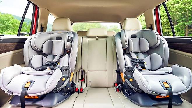 3열에도 부스터 시트나 유아용 카시트 장착을 위한 앵커와 벨트가 제공되며, 적재 공간은 기본 583L에서 3열 폴딩 시 1,572L, 2·3열을 모두 접으면 최대 2,735L까지 확장된다.