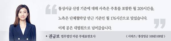 '통상임금 시급 산정 기준시간' 자체도 쟁점이 됐습니다. 통상임금 시급은 월 통상임금을 기준시간으로 나눠 산정하는데, 기준시간이 늘어날수록 시급과 각종 수당은 줄어들게 됩니다. 사측은 주 40시간 근무에 유급 주휴 8시간을 포함한 월 209시간을 기준으로 삼아야 한다고 주장했습니다. 반면 노측은 단체협약상 만근일 기준인 월 22일, 하루 8시간을 토대로 '월 176시간'을 주장했고, 동아운수 사건 항소심은 176시간을 적용했습니다.
