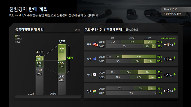 2030년 지역별 판매 목표도 구체화됐다. 북미 111만대, 유럽 77만대, 국내 58만대, 인도 40만대 등으로 설정됐다. 특히 북미와 유럽은 EV 비중이 각각 70%, 86%에 이를 정도로 전동화 전략이 강하게 반영돼 있다. 반면 인도(43%)와 기타 신흥시장은 내연기관차와 하이브리드 비중이 상대적으로 높은 구조다.